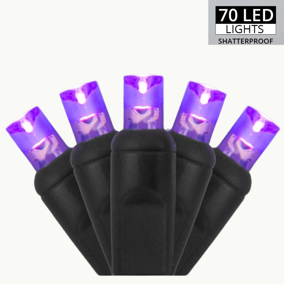 Purple Halloween String Lights – 70 Purple LED’s 24FT On Black Wire